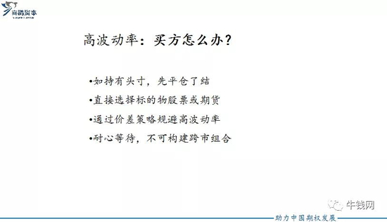 如果你真的想要去做高波动率,你就可以通过价差策略来规避高波动率。就像牛市价差,熊市价差。用最简单的一个策略来降低你的交易成本,最好就是耐心等待,不要去交易了。还有,市面上很多建议,建议进行双买,就是既买看涨又买看跌。比如说未来可能有行情,这个时候你也要考虑波动率,如果波动率过高的情况下,你双买。你去买看涨买看跌,哪怕行情未来波动,你也赚不到钱,为什么?波动率太高了,而且波动率它会很快就会回归。它是市场的一个情绪,我们市场的所有的价格都是人的情绪交易出来的,人的情绪它会回归的。打个比方,可能我很生气,我想打那个人,但是三五分钟之后我就想不打他了,因为我自己平静下来了。所以市场的波动率回归的很快,一定要等到合理的波动率我们才去交易,这是对于买方来说的。