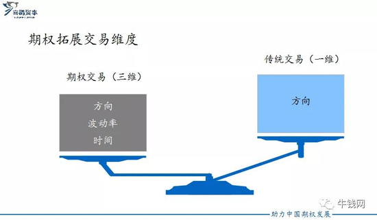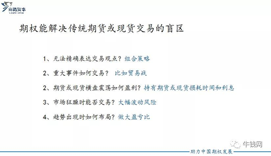 期权它确实是一个很好的工具,就是在于它能够解决我们传统期货或者股票交易里面的很多的一些盲区。对于交易来说,很多时候我们对一个标的是没有观点的,期权可以用一些组合策略赚取一些时间价值。还有一些包括重大交易,包括重大的事件上,传统的工具你不敢去交易,特别是今年的棉花,还有股票市场。像去年的豆粕、油脂油料这一块,受贸易事件的影响是非常大的。像今年的棉花上,靠近跌停板的次数有五次,为什么会有五次呢?它是一下子缓和又一下子紧张,所以事件性的影响非常之大的。我们用期货就没法搞,但是期权它有一个功能,就是我做买方的话,亏损是有限的,我的盈利是无限大的。那这个时候确实可以用小资金,我拿了三五万块钱,或者五万十万块钱,我买个看涨或者买一个看跌,只要有自己的观点,那就可以配置一下。损失有限,但是这五万十万块钱它代表的市值已经远远是100万,200万了。所以在重大事件面前用期权是首选的,因为用股票或者期货去重仓的话,万一错了怎么办?但是期权它亏损是有限的。