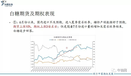 那如果卖出期权呢?假设在白糖这一块,我们持有白糖的期货,假设我持有多头期货的同时,我们来卖出一些虚值的看涨期权,收一些权利金,这个并不妨碍我们头寸的盈利,它反而可以给我们一些额外的收益,其实这个就是价格补偿。比如国际原糖,就是在价格很低的位置,包括我们现在在国际原糖上一直持有期货,然后我们卖出相应的,比如12.5美分、13美分的看涨期权,那你看国际原糖也没有涨,但是我们今年依然有一个收益,为什么?因为卖期权这一方给我们每个月差不多有1%-2%左右的收益,全年一累积其实还是蛮多的。