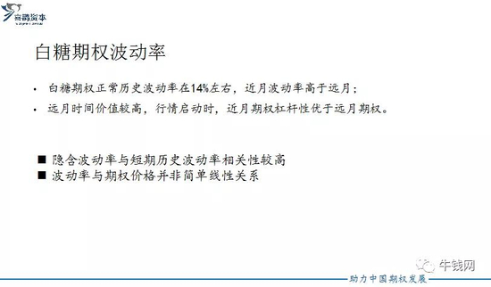 但是国内的商品期权还有一个问题,就是它的还是持仓量过小,为什么?开户门槛!很多投资者对这个工具确实也是并不太了解,当然后续的交易量、持仓量应该会逐渐的放大。其实我昨天(2019年8月31日)还在郑州参加期权论坛,跟朋友吃饭的时候聊到,想要把期权活跃起来,其实很容易的。根本问题不在于做市商,也不是在于期货公司,也不在于券商,主要还是在于交易所。如果他稍微宽一点,一下就活跃了,因为国内跟国际上不一样。昨天像那个芝加哥CME说交易量增长了多少,对不对?但国内不一样,国内增长多了也不行,少了也不行,它是合理的状态最好,所以持仓量其实就是在于交易所的表态的问题。那么正常来说,白糖的波动率在14%左右,所以我们就是看一下这个波动率,如果它的波动率是远远高于14%的话,这个时候大家如果要买的话就不要选择期权了,那么如果它的波动率靠近14%或者低于14%,那么这个时候用期权是很划算的,用白糖的期权是很划算的。所以这里大家可以记一下,14%它是一个历史的波动率,那么隐含波动率和历史波动率相关性是极高的,所以14%的对比性就很强了。