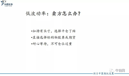 那对于对于卖方呢?那低波动率呢?同样反过来,低波动率不是收到很少的钱嘛,这个时候就少卖,控制你卖方的仓位,因为波动率低了你收不了多少钱。万一行情来个反向运作呢?它的波动率继续上涨怎么办?所以对于卖方来说,就是你了结头寸平仓。如果低波动率的话,我宁愿直接配置股票或者直接配置期货头寸,耐心等待,一定不要仓位波动。低的波动率不利于卖方,卖方就是要在高波动率的情况下,我们每个月收到的权利金才会多。