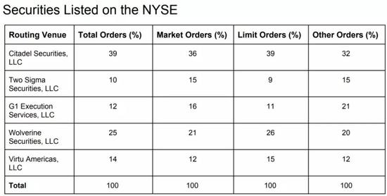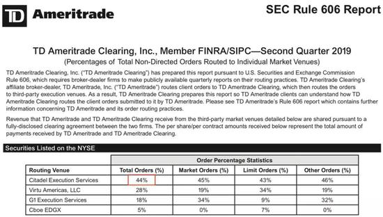 据TD Ameritrade2019年2季度的美国SEC6060报告,其将NYSE和Nasdaq挂牌股票的指令发送给了Citadel等四家高频交易商,其中发送给Citadel的指令分别占44%和43%。报告中显示,2019年第二季度TD Ameritrade收到Citadel Execution Services的付款为平均每股0.0015美元,用于将上市股票订单流向该场所。