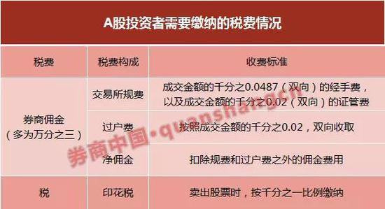 先来看A股交易佣金和税费。目前,国内券商佣金收费标准约为成交金额的万分之三,最低5元起,单笔交易佣金不满5元按5元收取。