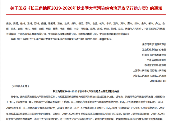 新浪财经讯 11月12日,生态环境部印发《长三角地区2019-2020年秋冬季大气污染综合治理攻坚行动方案》。