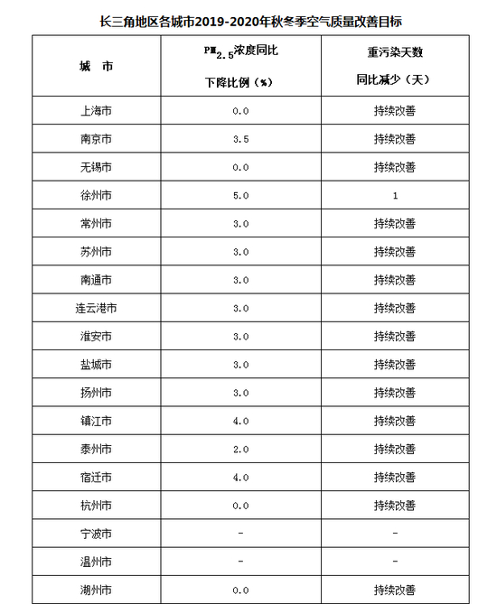 主要目标:稳中求进,推进环境空气质量持续改善,长三角地区全面完成2019年环境空气质量改善目标,协同控制温室气体排放。秋冬季期间(2019年10月1日-2020年3月31日),PM2.5平均浓度同比下降2%,重度及以上污染天数同比减少2%(详见附件1)。