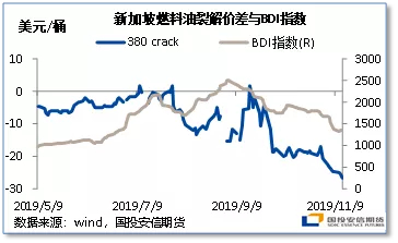 原油近期随着全球市场风险偏好的提升震荡偏强,欧佩克12月会议大概率延续此前减产量,在沙特份额绝对低位和伊朗、委内瑞拉产量绝对低位的背景下深化减产并落地执行并不容易,然而非欧佩克的产量增长仍是常态,在需求没有大的改观的情况下,长期来看很难走高,更可能通过价格中枢的下移完成对过剩产量的挤出。而航运市场近期重回弱势,对燃油价格的下跌推波助澜,长期或将回归宏观环境走弱和大国争端下的贸易往来下降,对燃油价格仍显利空。