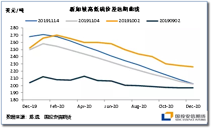 年中以来新加坡高硫价格一直呈现深度Back结构,远期曲线的最低点出现在2020年1月,基差的回归主要通过现货的下跌完成,体现了限硫影响的预期。然而,11月以来随着现货贴水的快速走低(图1),截至11月14日,远期曲线最大的变化在于12月与1月合约接近平水(图2),价格结构大幅走弱,也就是说市场对高硫价格最低点的预期有所前移,而根本原因在于现货端高低硫切换已经开启,长运距无脱硫塔的船舶对高硫的需求基本已经停滞,中短运距船舶高硫需求也开始下滑,现货价格的崩塌是对需求下滑的直接体现。