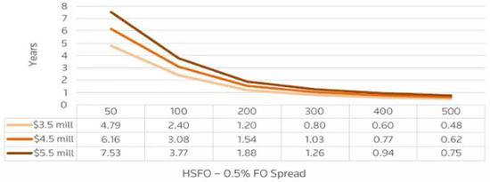 图5:高低硫价差与脱硫塔回收期(以每天消耗40吨燃料油为例)