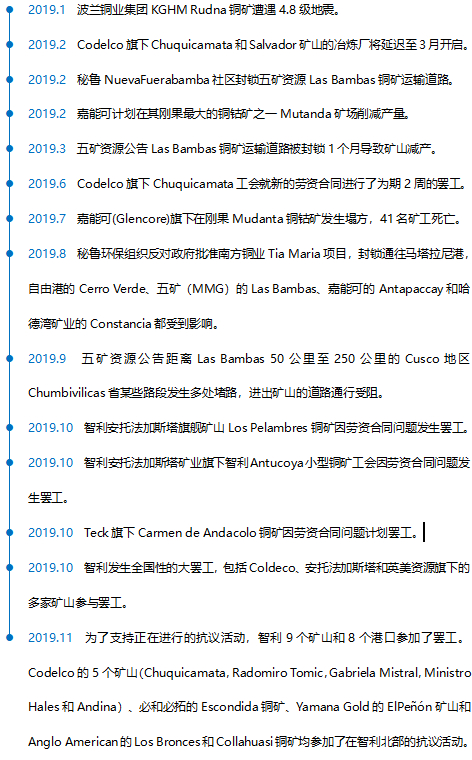 2019年以来铜矿端骚乱频发,尤其是南美洲的产铜大国秘鲁和智利频频发生骚乱和罢工,10月以来智利更是发生了全国性的大罢工,给以铜矿生产带来的很大的影响。