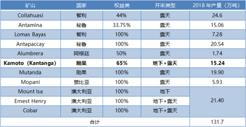 嘉能可是一家瑞士公司,成立于1974年,是全球大宗商品交易巨头,第三大铜制造商、第一大锌制造商和最大的煤炭出口商。公司旗下的大型铜矿包括型铜矿包括位于非洲的Kantanga旗下Kamoto等矿山,秘鲁的Antamina(33.75%),以及位于其他南美地区的Alumbrera、Lomas Bayas等,位于澳洲的Mount Isa、Ernest Henry和Cobar等。