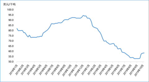 全球铜矿的供给紧张使得铜矿加工费TC/RC的全面下降,根据Mymetal调研的2019年海外铜精矿现货市场的TC报价一路下滑最低至54美金/吨,四季度以来下浮回升至59美金/吨。