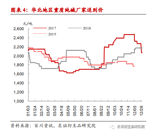 对于短期纯碱行情,我们依然不乐观。一方面从供应来看,目前纯碱企业依然维持高开工率,短期计划检修厂家较少,目前了解到的是湖北双环科技110万吨纯碱装置计划于12月26日停机检修,明年1月6日即复工,检修时间较短;此外,内蒙古苏尼特碱业20万吨/年的纯碱于11月至明年2月停机运行,预计三月恢复生产。而大连大化60万吨纯碱装置自10月21日点火以来顺利运行,目前厂家已经完全恢复生产,从而增加了市场供应端的压力;另一方面从需求来看,秋冬季是大气污染防治的关键时段,而国内纯碱企业以国企为主,目前环保限产对纯碱生产端的影响已经不大,主要是对下游需求端存在负面影响,尤其是轻质纯碱用户的受影响程度较大。此外,邢台市已经发布通知要求当地多家玻璃生产企业控制污染物排放水平,玻璃企业限产不利于提振重质纯碱需求。整体来看,我们认为短期纯碱市场低迷行情将延续。