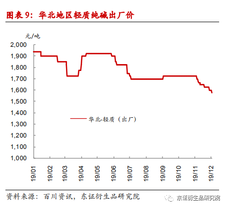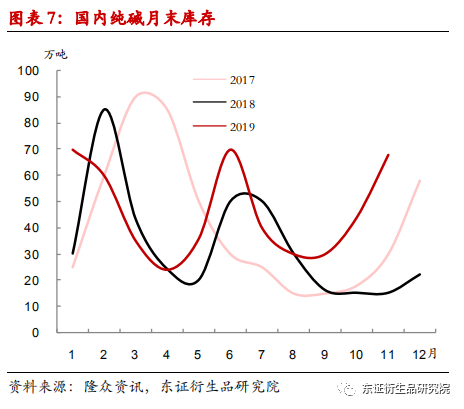 值得注意的是,由于下游需求端并没有出现相应的增长,导致国内纯碱库存压力较大。尤其是进入四季度后,产销失衡导致纯碱库存快速上涨。根据隆众统计,截至11月22日,国内纯碱库存为68.88万吨,较18年同期增加了53.54万吨,增幅巨大。库存快速累积一方面源于纯碱企业的高开工率,即便价格持续下跌,大部分碱厂依然是满负荷运行;另一方面也源于下游需求不振。重质纯碱方面,6月份多条浮法玻璃生产线放水冷修后,浮法玻璃在产日熔量水平明显下降,之后持续低于去年同期,从而对重碱需求构成负面影响;此外,轻质纯碱部分用户也出现需求萎缩,加上环保原因,部分小厂关停,轻质纯碱价格下跌,也对重碱价格构成一定拖累(两者历史价格相关性在90%以上)。