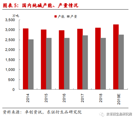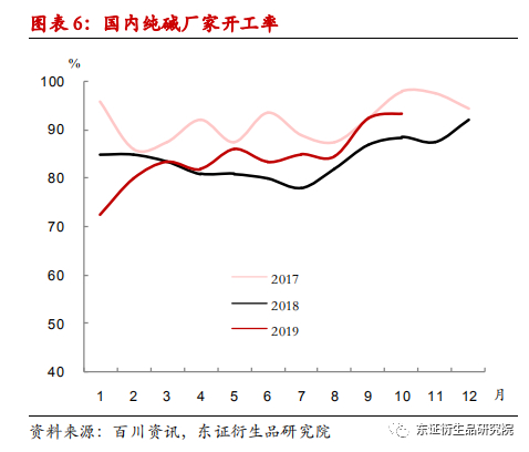 19年国内新增纯碱产能188万吨,淘汰落后产能32万吨,纯碱产能净增加156万吨。今年3月份之后,国内纯碱厂家开工率不断走高,并持续高于18年同期。