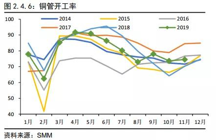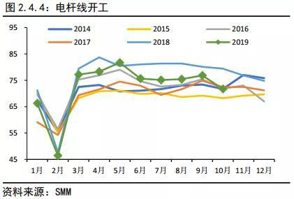 国内铜终端消费主要集中在电力电缆、家电、汽车、房地产等行业板块。其中电力电缆占比接近37%,家电(空调等制冷设备)占15%,汽车行业占比8%,建筑占比21%。铜材做为电解铜到消费终端的中间过渡品,开工情况能体现下游的消费状况。铜材包括铜杆线、铜管、铜板带等。铜材的开工数据相对好追踪,从铜材情况看,今年需求表现还不错。但需要注意的是,这毕竟是样本统计,不能代表整体情况,接下来还是看具体的下游行业。