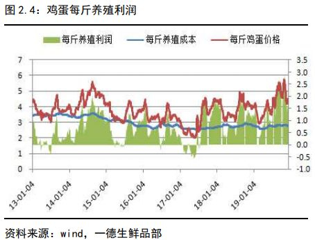鸡蛋生产成本主要由鸡苗、产蛋前的育成期及产蛋期的饲料费用构成,其中饲料成本占比较大,2019年由于补栏情绪的持续高涨,蛋鸡苗价格上涨,占总成本比重上升,原来养殖户计算利润时多按照每天成本和产出去比较,接近淘汰时若一段时间每日不盈利就开始进行淘汰,但2019年由于淘汰鸡价格的上涨,在收入占比中大幅提升,因而养殖户会综合考虑淘汰鸡价格的波动和蛋鸡每日的成本和产出情况。