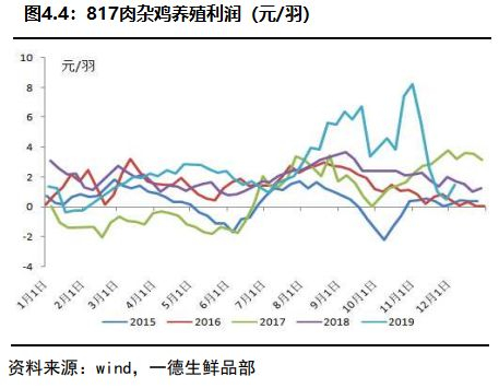 另一方面是间接替代。2018年我国猪牛羊禽肉产量8517万吨,其中,猪肉产量5404万吨,占比63.45%,禽肉产量1994万吨,占比23.41%,牛肉羊肉产量分别为644、475万吨,分别占比7.56%、5.58%。禽肉作为我国消费量第二的肉类蛋白是猪肉的主要替代品,而肉禽中又以鸡肉为主,人们不吃猪肉吃鸡肉导致鸡肉消费量增加,从而导致817肉杂及淘汰鸡价格均上涨,前期淘鸡价格的上涨导致蛋鸡淘汰量增加,且商品代蛋鸡转817种鸡导致红蛋供应减少,一定程度上抑制蛋鸡存栏增长,但随着淘汰鸡价格的回落,市场淘汰量逐步回归正常水平,且未来若肉禽与猪肉脱钩,817种蛋不再有利可图,会有大量817种转商现象出现,导致市场鸡蛋供应增多。