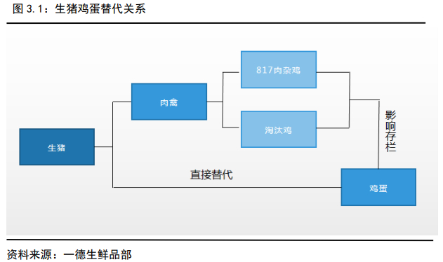 正常情况下季节性供需变动引起鸡蛋价格波动,而今年生猪对鸡蛋的供需均产生了较大的影响,一方面是鸡蛋与猪肉之间的直接替代,生猪疫情的频发及价格的快速上涨使得学校、机关食堂等集中性采购量下降,转而采购鸡肉鸡蛋等替代品,同时猪肉价格的上涨使得居民更多的去消费鸡肉、牛羊肉、鸡蛋等蛋白。