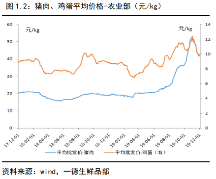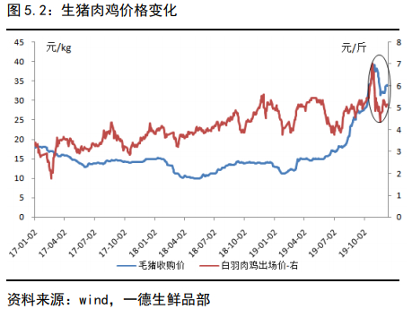 猪肉作为我国最大的肉类消费品种,占全部肉类消费的60%以上,农业农村部数据显示,截止2019年10月,生猪存栏下降41.4%,随着生猪价格的上涨,下游对猪肉的消费量也随之减少,逐步被其他类蛋白(禽肉、牛羊肉、鸡蛋等)替代,从而导致了全养殖行业的高价,虽然前期价格走出了类似的走势,但肉鸡、蛋鸡不等于猪,行情走势还是有所不同。
