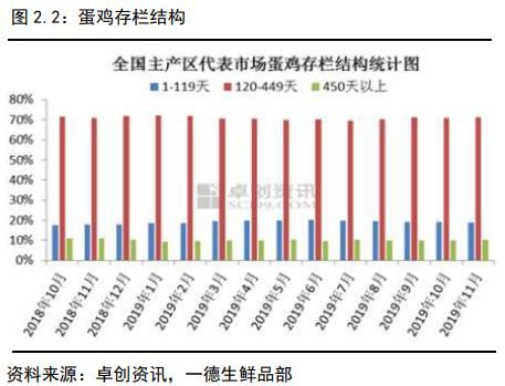 卓创数据显示,截止2019年11月,全国在产蛋鸡存栏12.612亿只,环比上涨0.17%,同比上涨2.2%,蛋鸡存栏量涨至历史较高水平。淘汰鸡出栏量245.7万只,环比上涨12.19%,同比上涨6.97%。全国代表企业鸡苗销量为4712万羽,环比上涨0.4%,同比上涨8.87%。120日龄以下的后备鸡平均占比18.76%,环比减少2.14%,依然处于往年较高水平。