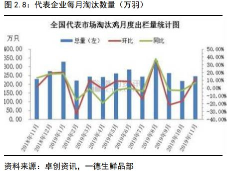 卓创数据显示,2019年11月淘汰鸡出栏量245.70万羽,环比上涨12.19%,同比上涨6.97%。