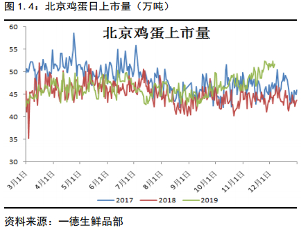 2019年初现货价格的下跌使得淘汰量增多,叠加18年秋季补栏不足造成2019年初蛋鸡存栏量跌至低位,后期随着鸡蛋价格的回升及蛋白替代逐步产生效应,市场补栏量同比大幅增长,蛋鸡存栏逐步回升,9月后存栏有明显增加,鸡蛋供应量呈现震荡上行趋势。