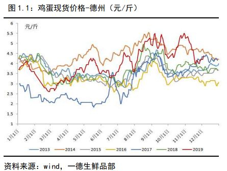 (3)7月后受中秋节备货等因素的影响,现货再次进入上涨通道,且表现出大幅的上涨及下跌,农历中元节前后大量淘汰老鸡,前期补栏的蛋鸡逐步开产,但数量相对较少,使得当期供应增量不大,同时生猪价格相对前期有大幅提升,利好鸡蛋需求,供应的小幅增加及需求的强势导致2019年的中秋行情尤其强势,最高价甚至超过2014年同期。