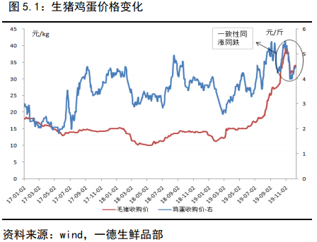 我们对2013-2019年的鸡蛋与猪肉批发价格进行对比发现,2019年以前鸡蛋与猪肉价格相关性并不高,进入2019年后相关性大大提升,可达到88%,十一之后相关性更是大幅提高,相关系数在90%以上。