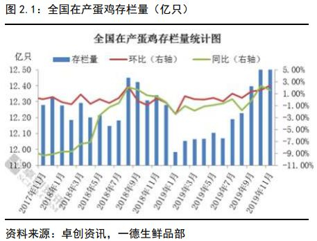 卓创数据显示,11月代表企业鸡苗销量为4712万羽,环比上涨0.4%,同比上涨8.87%。根据季节性,每年上半年为补栏旺季,2019年全年鸡苗销量相对2018年同比增长,其中6-7月鸡苗销量同比有较大增幅,对应2019年10-11月蛋鸡存栏增长,截止2019年11月,蛋鸡存栏已涨至历史同期较高水平,在当前市场补栏下,未来存栏仍以增长为主。
