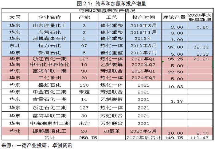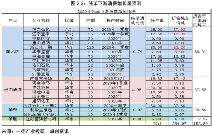 从纯苯投产情况看,2019年新投产产能在109万吨,2020年新投产产能在207万吨,把盛虹石化和古雷石化按2020年底投产计算,理论最大产量在150万吨左右,但考虑到最大概率投产的装置只有浙石化一期和盛瑞加氢苯,再考虑开工率情况,理论2020年新增纯苯量在120万吨附近。