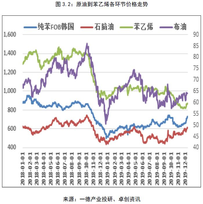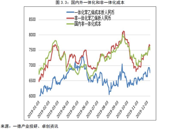 从成本端看,纯苯美韩套利窗口的持续打开,支撑国内纯苯。国内纯苯进口量的减少,使纯苯显性库存重心下移,支撑纯苯价格。加氢苯在4000-4200元/吨附近,对纯苯存在支撑。从原油一体化计算,原油50-70美元/桶,苯乙烯价格在5580-7000元,全年主流运行价格在6650-7650元。