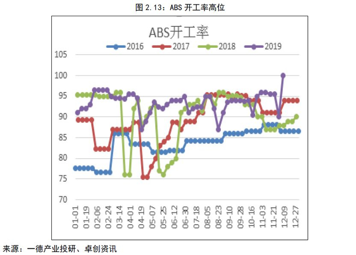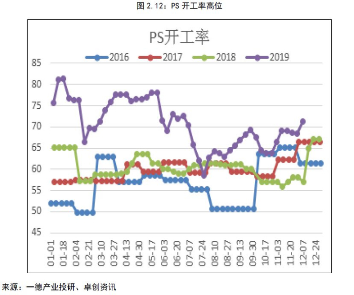 从下游三大消费来看,2019年开工率都居于高位,原有装置的开工率弹性很小,继续提升的空间有限,那么新投产装置投产的概率也存在疑问,尽管上文我们给出了比较高的投产率,但这部分也要打个疑问。投产进度还要看当时的生产利润和需求量。在乐观情况下,如果明年房地产,汽车,冰箱等数据转好,对需求或有拉动,或能兑现部分开工。但处于低位的PP、PE也会对ABS、PS存在替代。在上文中我们计算了,苯乙烯和下游比相对过剩,而下游投产率的兑现又更低一些,那么过剩的程度会加大。