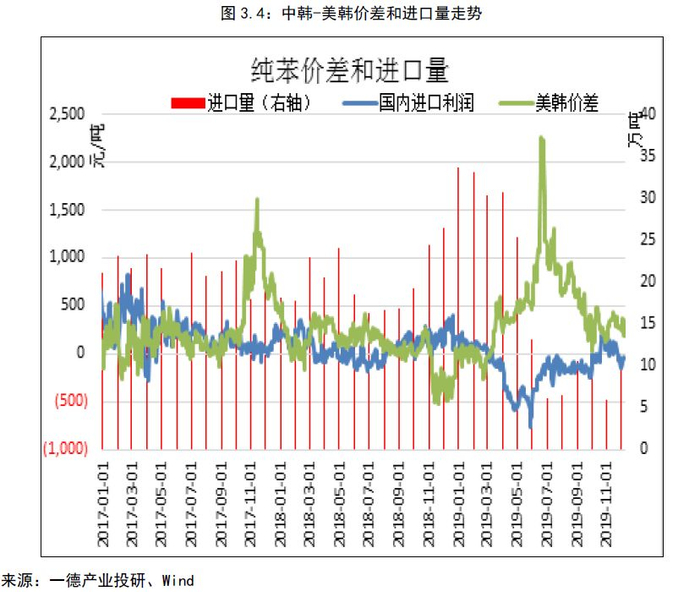 2. 纯苯美韩套利窗口长期打开给予内盘纯苯支撑;进口量减少,显性库存减少