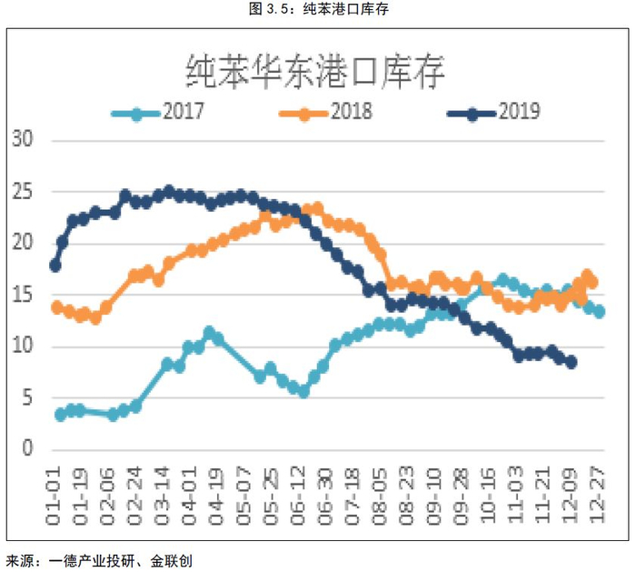 从纯苯的下游看,苯乙烯、己内酰胺、苯酚都有新投产,理论消耗纯苯量较大,在255万吨左右。但下游投产进度较慢,且开工率偏低,因此实际消耗纯苯量远低于此值。苯乙烯装置我们按浙石化、恒力石化、辽宁宝莱都在一季度投产,且全年开工维持在75%计算,苯乙烯产量在109万吨,需要纯苯86万吨。己内酰胺、苯酚、苯胺计算的时候,把有计划的投产都考虑在内了,计算值就偏大一些,计算纯苯需求量66.7万吨;如果我们只计算己内酰胺的内蒙庆华、河南神马,以及苯酚的三个投产企业,计算出来纯苯需求量在41.5万吨。总体看,纯苯下游最大消耗纯苯量在153万吨,大概率在127万吨。纯苯新增产量和新增消费量看,纯苯略偏紧一点,紧缺量大约在7万吨。