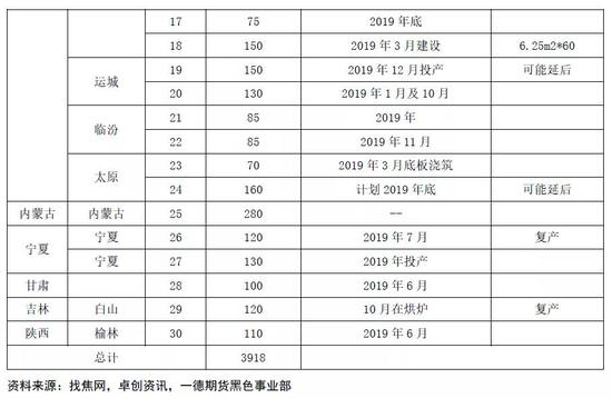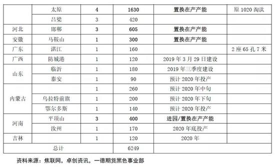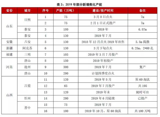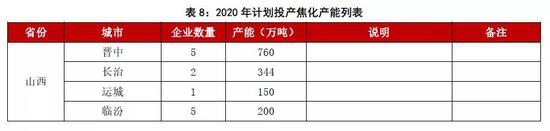 同前文所述,2017-2018年焦化行业盈利能力获得快速回升,企业投资及扩建意愿相对较高,期间仍有较多产能在建,计划于2020年前后陆续投产。下表为2020年可能投产的部分产能: