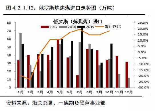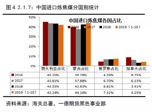 今年1-10月累计进口炼焦煤6663万吨,已超过去年全年的量6492万吨,预估全年同比增涨17.2%,大幅超于预期,进口平控政策力度减弱。主要原因还是进口煤相对国内煤有比较大的价格优势,以山西低硫主焦和进口一线焦煤价格对比,今年价差最高520附近,其窗口时间较长,企业进口外煤能有效降低成本,增加效益。其中蒙古和澳大利亚仍是主要进口国,两国总量占比在86.4%左右,比去年提升0.24个百分点,不同的是今年蒙煤占比提升,澳煤进口占比减少,主要是受2019年5、6月份中澳关系影响。蒙煤进口比较平稳,除了受节日影响外,其余时间进口都比较顺畅。另外受国际炼焦煤供应宽松影响,从俄罗斯、加拿大进口的炼焦煤同比进口增幅较大,其中2019年1-10月俄罗斯炼焦煤进口同比增涨17%左右,加拿大炼焦煤进口同比增涨37%左右。