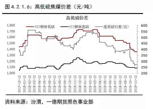 今年焦化企业利润下降比较明显,由于煤矿和下游焦化企业的垄断地位不同,煤价压缩较慢,倒逼焦化企业寻求成本更低的入炉煤配方,多用价格便宜的中高硫主焦煤以及一些不在炼焦煤序列里的低硫低灰的弱粘煤,配出合意的灰硫以及强度,减少价格高的低灰低硫主焦煤的配比量。这就表现出在价格下跌过程中,高低硫价差收缩比较明显,高硫主焦表现得更加抗跌。