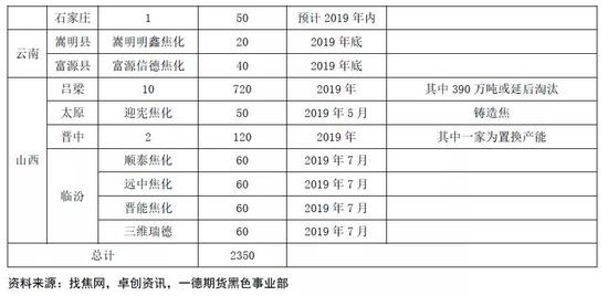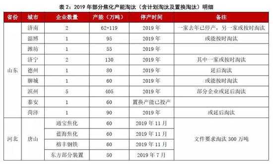 假设山东地区产能淘汰严格执行,2019年预计全国淘汰焦化产能2350万吨左右。目前山东地区上述企业基本均正常生产,淘汰产能暂无进一步政策公布,初步预计未来一个月去产能难度相对较大。目前淘汰较为明确的企业约有2-3家,约300万吨。若按照淘汰产能不严格计算,2019年约淘汰焦化产能1950万吨左右。