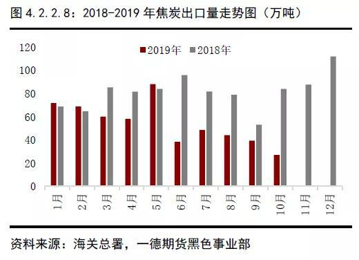 2019年煤焦进出口市场出现较大变化,受国外钢铁产量负增长的影响,进口焦煤价格连创新低,导致进口焦煤大量涌入,据海关总署数据,1-10月累计进口炼焦煤6663万吨,同比增长17.2%。得益于国外焦煤的低成本,焦炭市场下半年进口大幅增长,澳洲、日本及印尼焦炭逐渐流入国内市场,挤压了国内焦炭市场需求的同时对国内焦炭出口形成冲击。