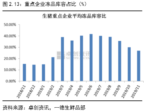截止2019年11月,卓创资讯数据显示重点屠宰企业平均冻品库容比27.01%,环比下跌2.95%,同比上涨11.81%,1-11 月平均冻品库容比33.16%,同比上涨13.84%。2019年3月抛售及低价导致冻品库存大幅上涨,8月后随着价格的上涨冻品逐渐出库,春节前冷库需出货回笼资金,且当前猪价较高且量少,2020年冻品库存预计持续低位。