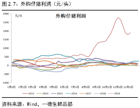 整体来看,2019年生猪市场迎来供应与需求的双降,猪价维持高位,仔猪及能繁母猪价格也有大幅上涨,养殖利润及养殖成本均有大幅提升,在高养殖成本下三元回交成为主流,疫情影响下增加了养殖风险成本,影响当前存栏恢复速度,国家也出台各类政策来激发养殖积极性,后期重点关注非洲猪瘟情况及市场复养情况。