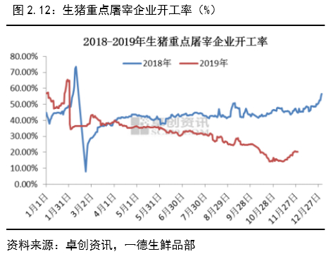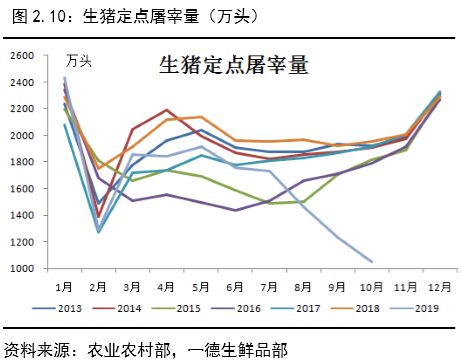 据机构调研情况来看,猪肉消费降幅在30%以上,2019年四季度属于年内猪肉消费旺季,可以看到猪肉消费的最大降幅,部分地区消费下降达到50%以上,消费的下降可以分两部分看: