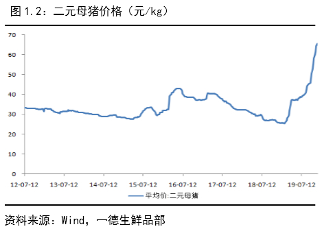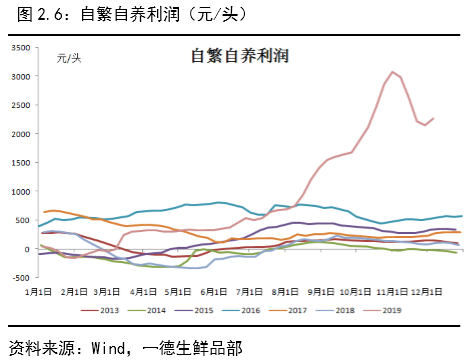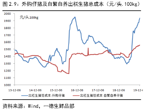 外购仔猪成本=外购仔猪+饲料成本+防疫成本+风险成本,自繁自养成本=母猪成本均摊+饲料成本+防疫成本+风险成本,各环节成本相对往年均有所提升,其中防疫成本大概在0.5元/kg,假设风险系数为0.3,且外购仔猪风险相对高于自繁自养风险,非洲猪瘟前养殖成本在12.5-13.5元/kg左右,自繁自养与外购仔猪成本不相上下,风险成本大概在3.75元/kg,预计外购仔猪与自繁自养仔猪成本差在3.8元/kg,因而我们判断外购仔猪成本相对往年抬升9.05元/kg,自繁自养成本抬升5.25元/kg,因而在当前状态下生猪价格在20元/kg以上才能有效的激发养殖户的补栏热情。