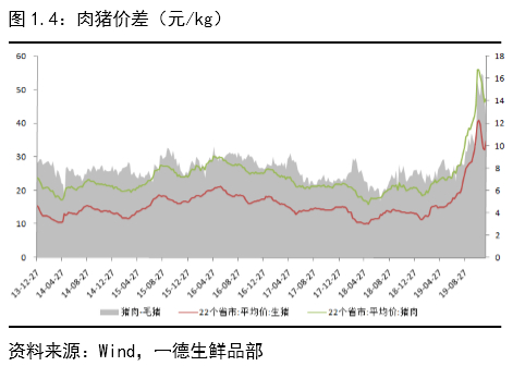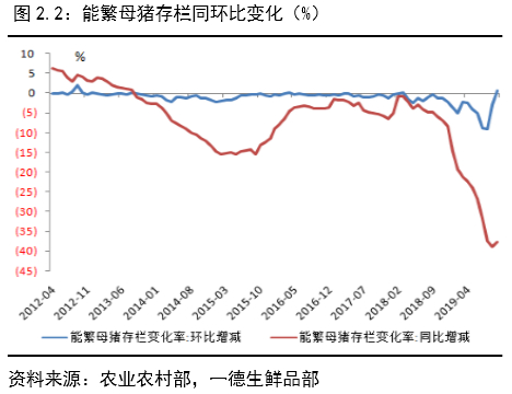 10 月生猪价格大幅上涨至40元/kg,高猪价高养殖利润对应养殖户的高补栏情绪,但由于能繁母猪价格较高且供应不足,因而大都以三元转种为主,从10月开始能繁母猪存栏回升,而生猪由于部分转去做母猪导致生猪存栏环比仍下降,根据生猪繁育周期推算,2019年10月后能繁母猪存栏环比的回升对应2020年8月后生猪出栏量的回升。