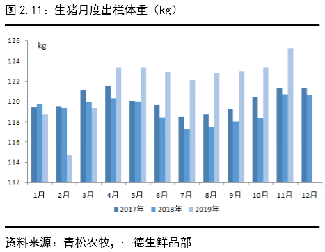 2019年生猪定点屠宰量16577.35万头,同比去年减少16.93%,且2019年1-7月受疫情抛售影响,屠宰量处于正常水平,7月后随着抛售的结束,全国生猪存栏水平大幅下降,屠宰量大幅下降,屠宰企业开工率也大幅下滑,截止2019年10月,生猪定点屠宰量同比下降46%。2019年1-11月生猪出栏均重121kg,去年同期均重119kg,2019年上半年受抛售影响,出栏体重相对较低,后期随着猪肉缺口的打开及价格的上涨,疫情大面积爆发减少,出栏体重逐步变大,一定程度上填补缺口,除去疫情影响,2020年生猪将延续大体重出栏趋势。