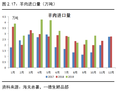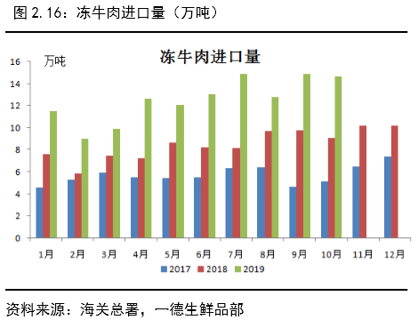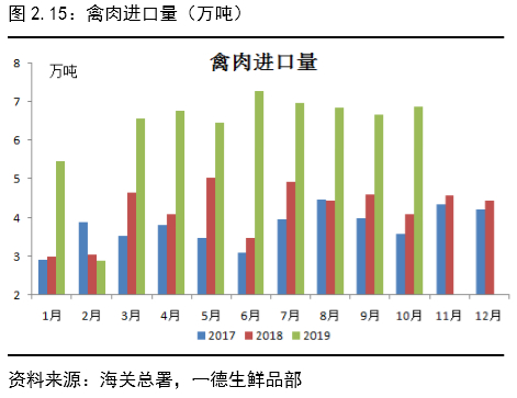 整体来说,进口肉对应总产量占比较少,2019年由于鲜肉的高价,鲜冻肉价差扩大,食堂、加工厂、餐馆等对鲜肉的需求量大大减少,2020年国内冻品库存会保持低位,进口量预计持续高位。除猪肉外其他猪肉替代品进口量也有不同幅度上涨,其中1-10月禽肉进口量62.79万吨,同比增长51%,冻牛肉进口量125.48万吨,同比增长53%,羊肉进口量25.05万吨,同比增长9%。