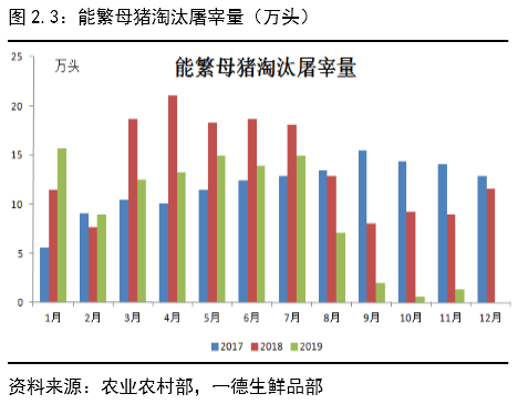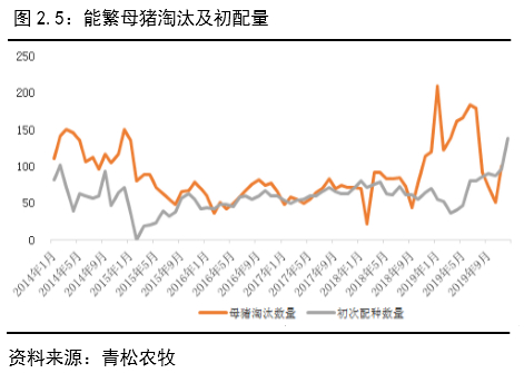 2019年11月生猪存栏环比增长2%,这是自去年11月以来首次环比回升,能繁母猪存栏环比增长4%,已连续两个月环比回升,11月能繁母猪存栏屠宰量环比增长137%,同比下降86%,10月能繁母猪淘汰屠宰量处于历史低位。年出栏5000头以上规模猪场的生猪存栏环比增长1.9%,能繁母猪存栏环比增长6.1%,大规模企业已经连续三个月环比增长。