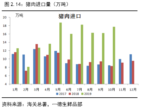 2018年全球猪肉进口量为790.6万吨,预计2019年增长至876.6万吨,部分国家有固定进口需求,留给中国的进口肉弹性较小。海关数据显示,2019年1-10月猪肉累计进口量150.31万吨,同比增加50%,其中,10月猪肉进口量17.74万吨,环比增长9.6%,同比增长113%,为2019年同比增加最多月份,主要原因在于10月猪价的超预期快速上涨导致市场情绪乐观,大量进口商高价从国外进口猪肉,大量进口肉及国产冻肉春节前冲击国内市场,11月随着鲜猪肉价格的下跌,冻肉下跌幅度更大,近乎腰斩,进口商亏损严重。