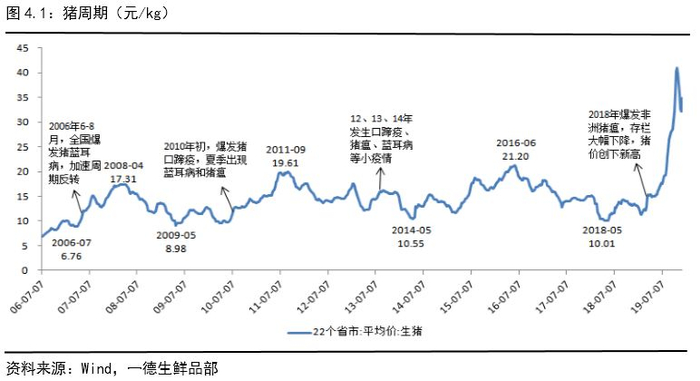 2019年生猪存栏持续下降,猪价正式进入上涨周期,主要分为四个阶段: