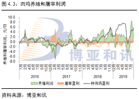 本轮周期不仅对生猪产业产生了巨大的影响,同时对全养殖行业产生了较大影响,尤其是禽类养殖。2015年后受国外禽流感影响,年肉种鸡引种量持续低于75万套,2018年对应2015年的祖代引种不足,肉鸡价格正式进入上涨周期。非洲猪瘟发生后在替代的逻辑下,肉鸡存栏大幅扩张,替代效应造成的价格强势超出人们预期,肉鸡40天的养殖周期在2019年5月底经历一次崩盘,但由于生猪缺口过大且5-6月补栏量过低,肉鸡价格在7月底重拾上涨,后期表现为与猪价一致性的同涨同跌,但不得不警惕的是,猪非鸡,鸡非猪,肉鸡早晚会脱离生猪逻辑走自身基本面,5月肉鸡价格的崩盘现象会再次出现。